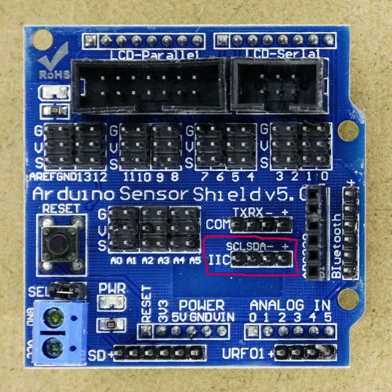 Look for the IIC connections on the Sensor Shield as marked on the following picture.
